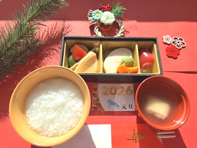 「お餅風ムース」を使用し、軟らかく噛めるお餅でお雑煮を提供しております。また、お重をイメージし、お節を楽しんで頂けるよう盛り付けも工夫いたしました。